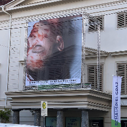 Fotokunst von Gottfried Helnwein auf Fassade von Oper, Schauspielhaus und Volkskundemuseum in Graz im Rahmen von UN-Kampagne